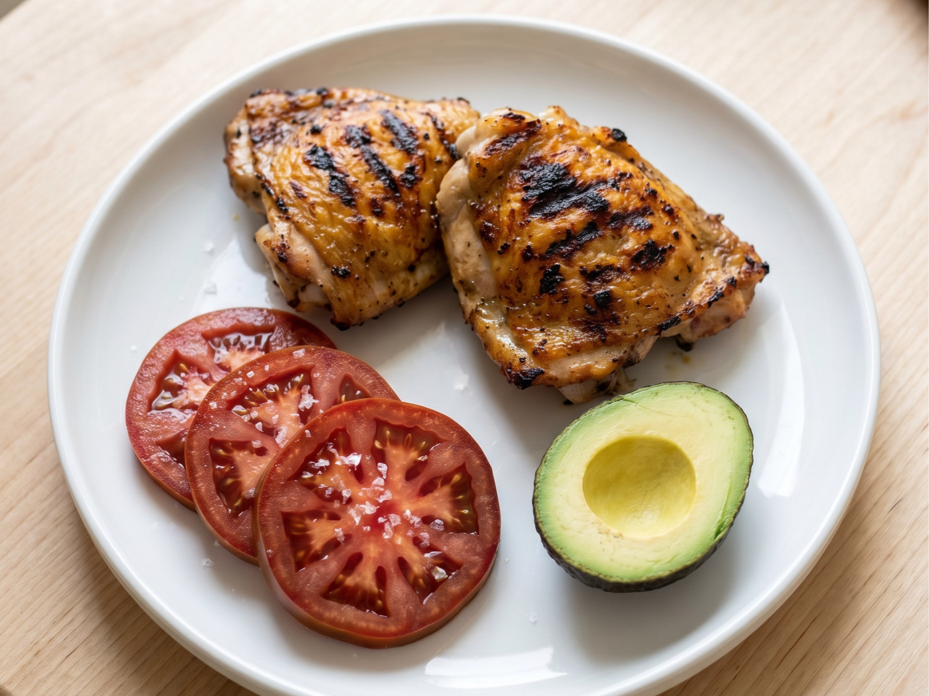 Chicken thighs. Flank steak. Roasted sweet potatoes. Ripe tomatoes with salt. Sautéed broccoli. Macadamia nuts. Avocado. Wild-caught salmon. Scrambled eggs.